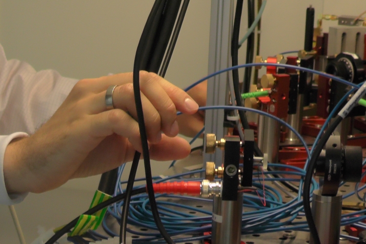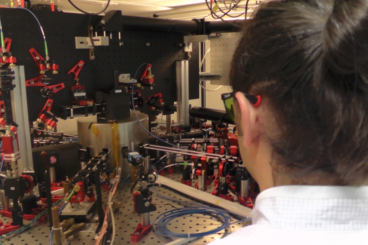 - Der Aufbau besteht aus Linsen, Lasern und einer Vakuumkammer; Foto: Lukas Schröter