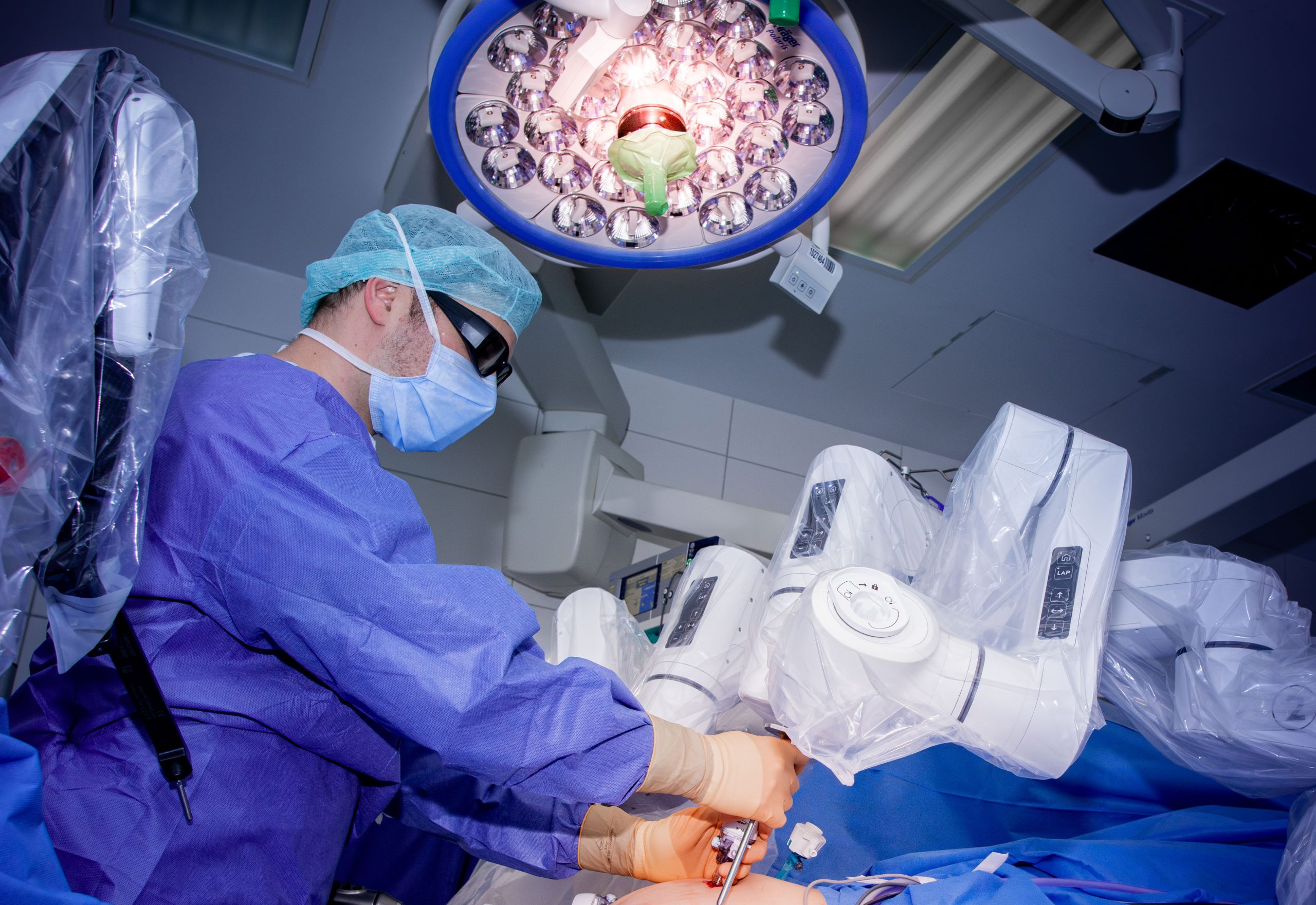 Dr. Jan Arensmeyer beim „Docking“ des Dexter-OP-Roboter an einem Patienten im UKB // Quelle: Universitätsklinikum Bonn.