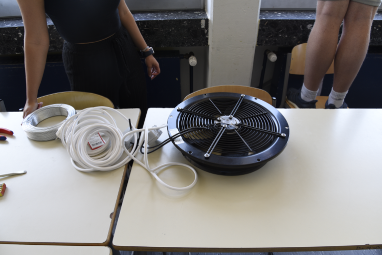 Als wir am Raum angekommen sind, mit allen Rohren und Hauben im Gepäck, müssen wir erstmal warten, denn es wird noch unterrichtet. Nach dem Gong und vielen verdutzten es geht es los. Tische werden verrückt und Equipment ausgepackt. Die drei Studierenden bekommen eine Leiter vom Hausmeister gestellt und klettern sie hoch, um die Fensterfront abzukleben. Frank Dieball, Leiter des Projektes, ist mit vor Ort und erklärt: „Es war sehr schwierig, eine passende Folie zur Abdeckung dieses Fensters zu finden, da es sehr lang, aber nicht hoch ist.“ Beim Ventilator haben die Studierenden wirklich Glück: Die Decke des Klassenraums hat überall kleine Löcher, die den Lärm schlucken sollen. Somit lassen sich einfach Kabelbinder hindurchstecken und der Ventilator aufhängen. Hauben und Rohre haben sie schon vorher zusammengebaut. Im nächsten Schritt müssen alle drei Studierende anpacken, denn das große Zentralrohr soll aufgehängt werden. Da sie nur eine Leiter haben, werden die Schultische mitbenutzt.