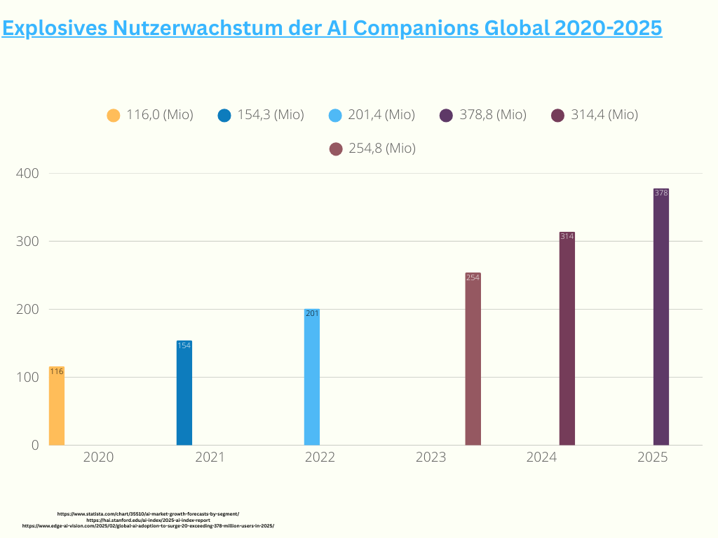 Bild: Säulendiagramm zum Wachstum der AI Companion Nutzer von 116 Millionen in 2020 auf 378,8 Millionen in 2025. Erstellt von: Ayse Can