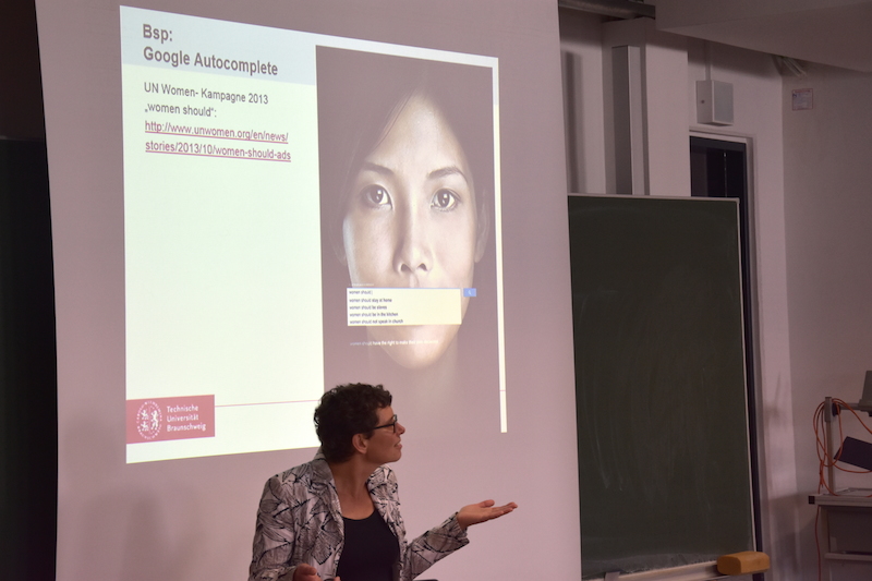 Wenn man bei der Suchmaschine Google "Frauen sollten…" eingibt, ergänzt sie automatisch "… keine Rechte haben". Das ist ein Beispiel der UN Women-Kampagne aus 2013, die aufzeigt, welche Wertvorstellungen in der Suchmaschine hinterlegt sind. "Sexismus wird von Google widergespiegelt und verstärkt", so Baths Überzeugung, Daraus resultiere aber eine Verantwortung auf Seiten der Informatik. In der sich daran anschließenden Diskussion mit den Studierenden kam die Frage auf, ob Autocomplete-Funktionen dann überhaupt noch sinnvoll seien, denn der Algorithmus basiere ja in der Regel auf den Häufigkeiten der Suchanfragen.